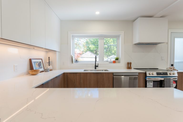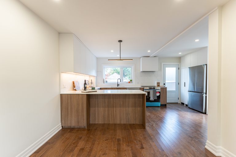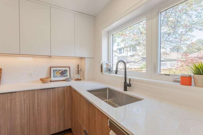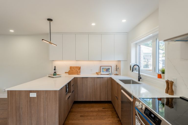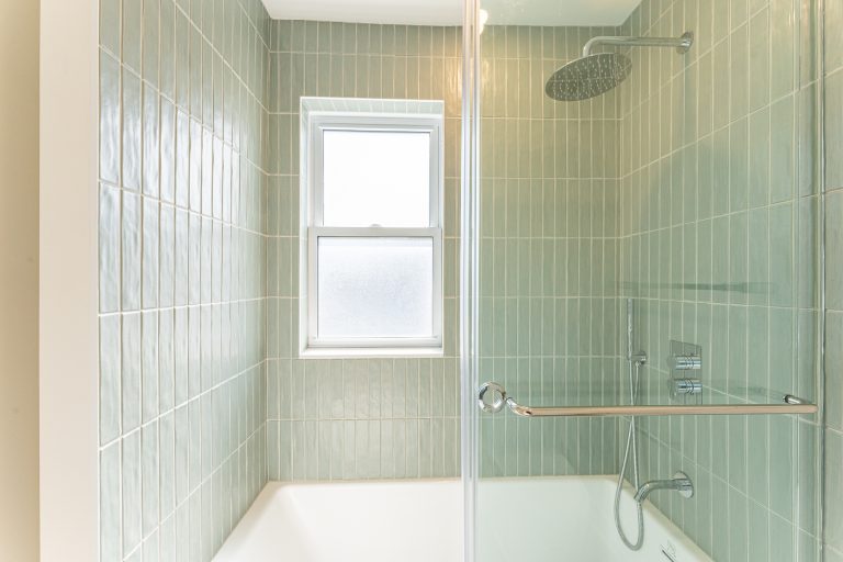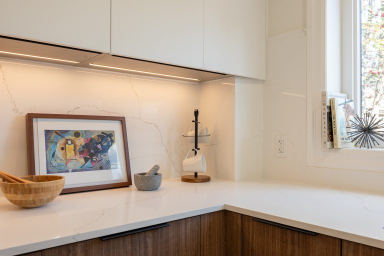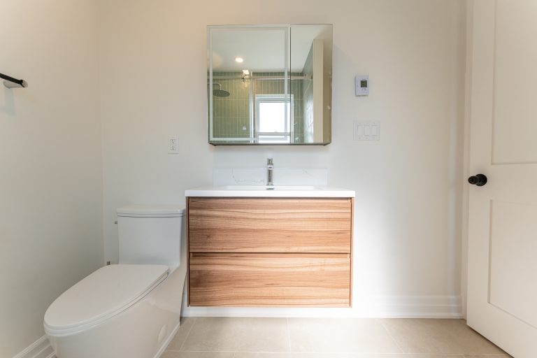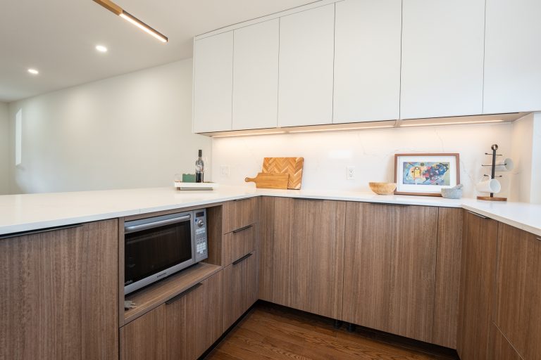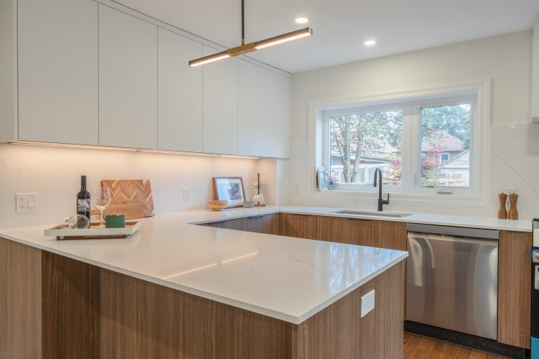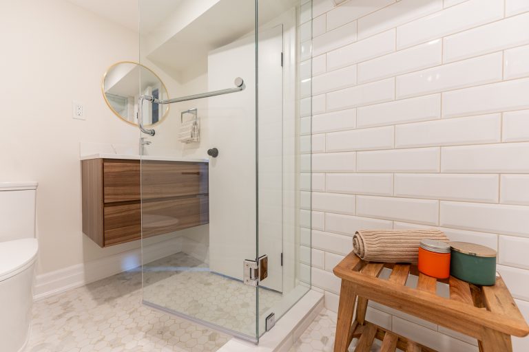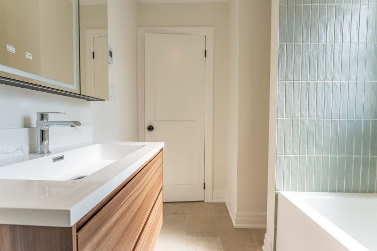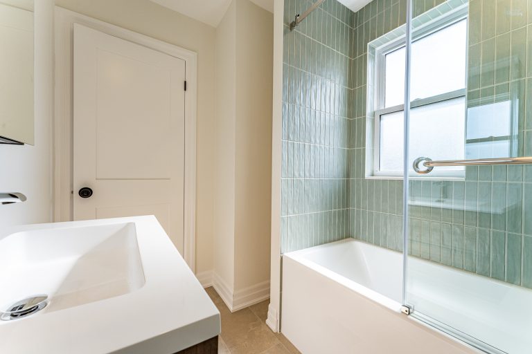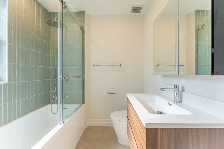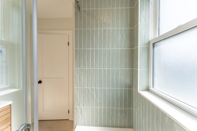 This multiple home renovation by Norseman Construction highlights our interior design team’s talent for creating modern, functional spaces. The bathroom features soft green tiles, a sleek glass shower, and a minimalist vanity, blending elegance with serenity. In the kitchen, warm wood cabinetry contrasts beautifully with clean white finishes, while thoughtful lighting and layout maximize functionality and style. These spaces are designed to feel both inviting and practical for everyday living