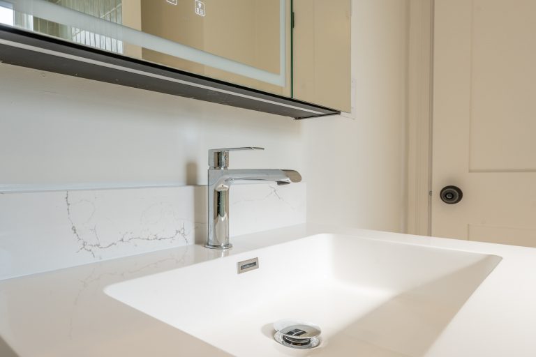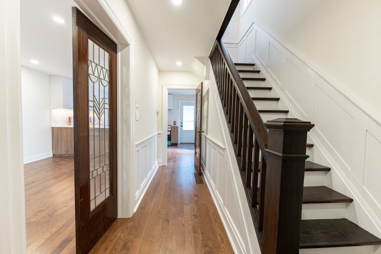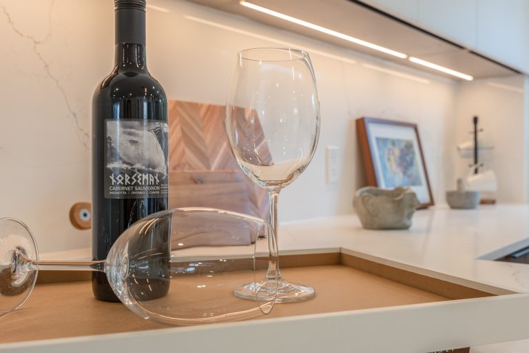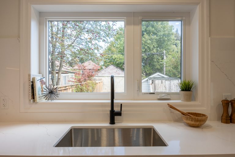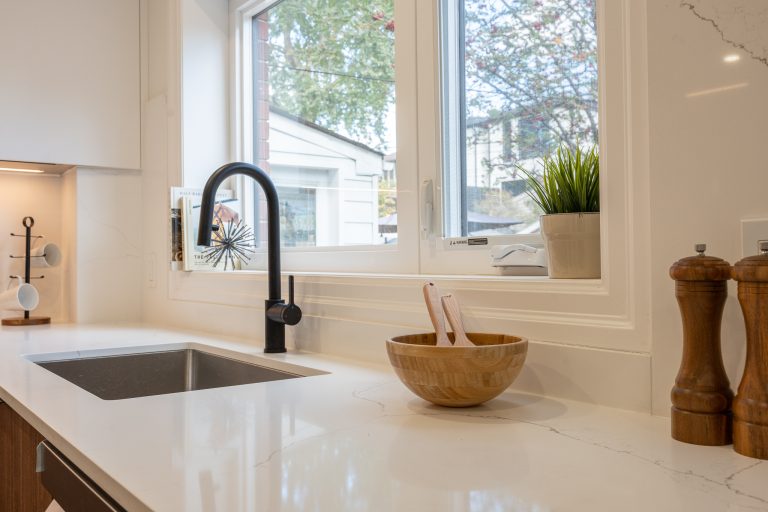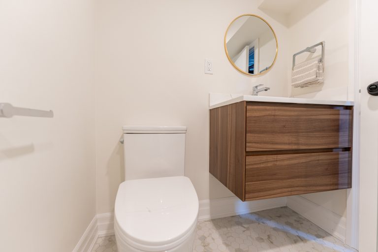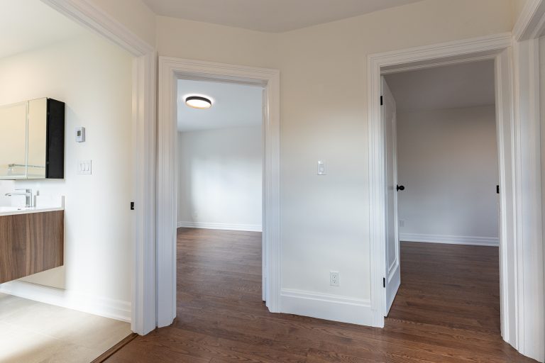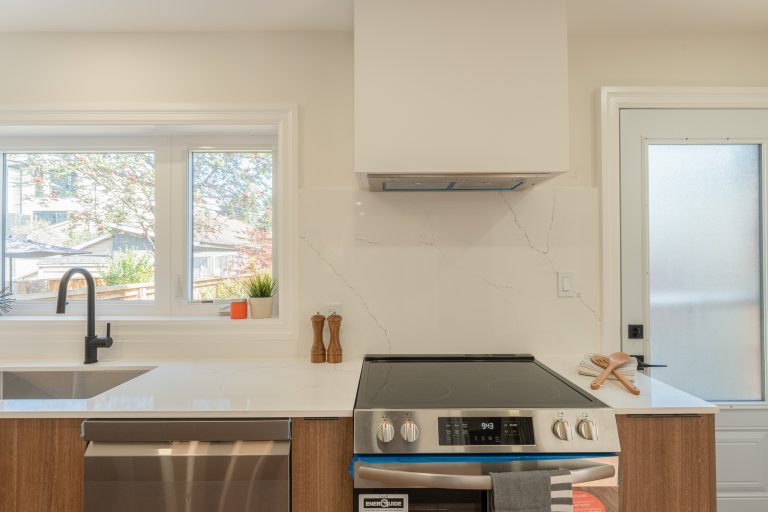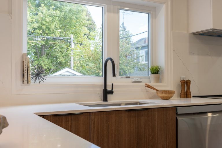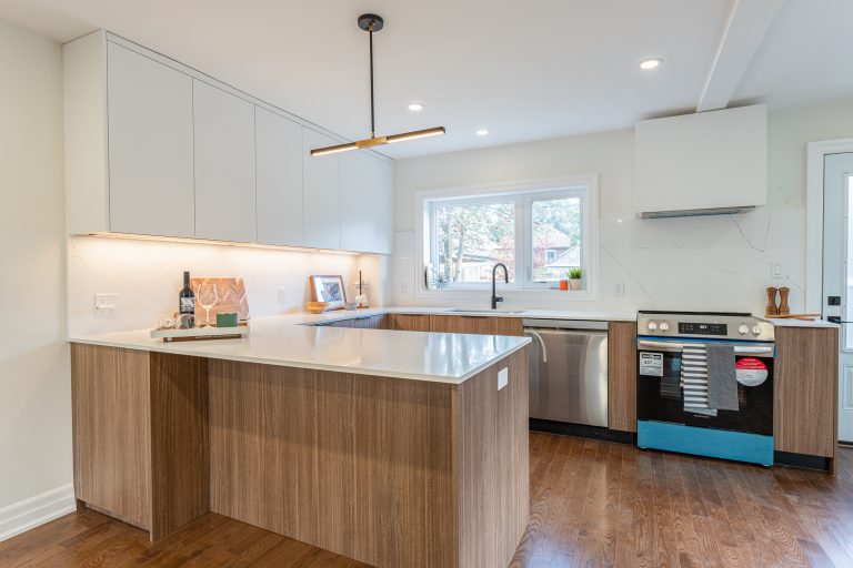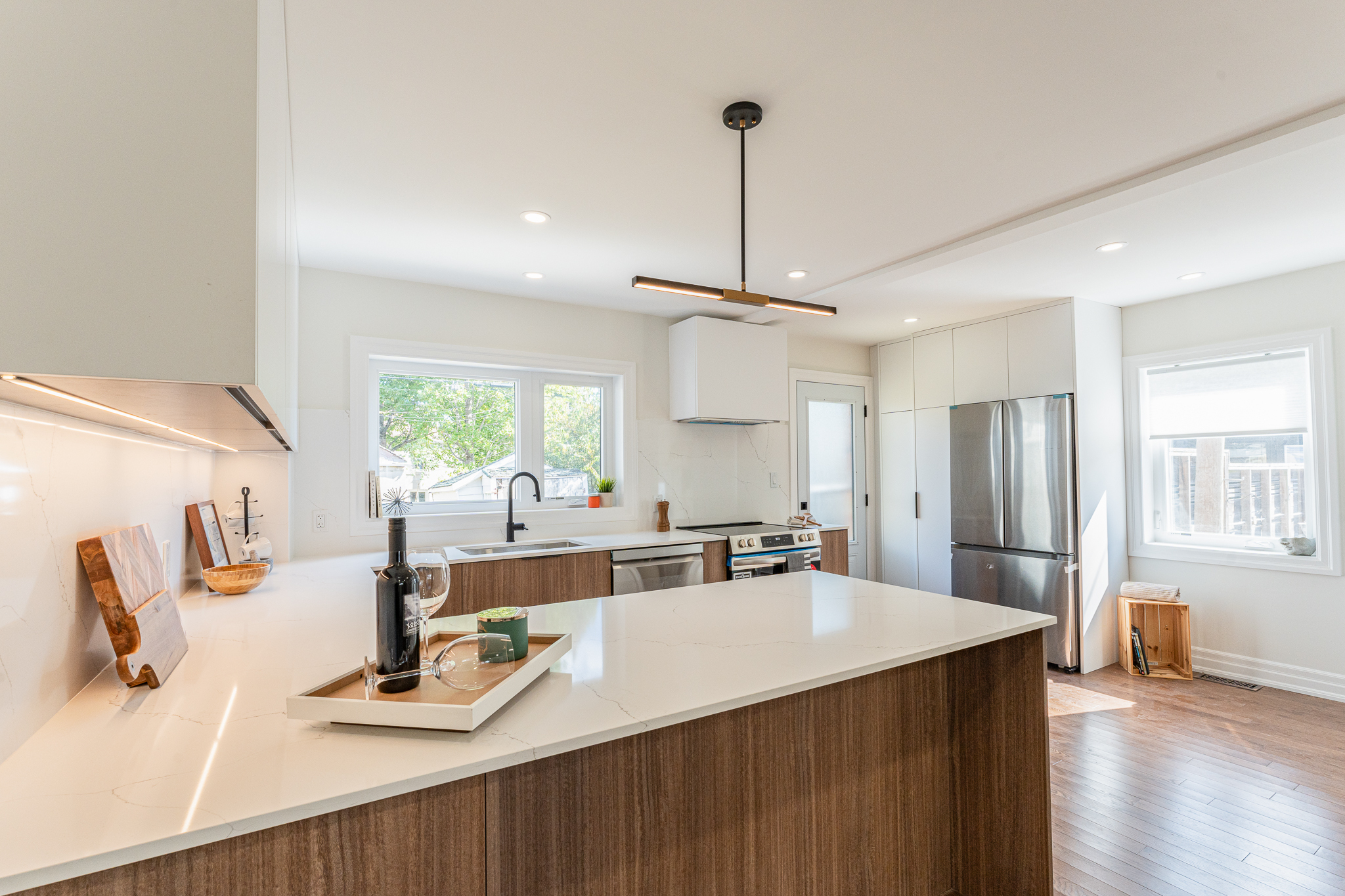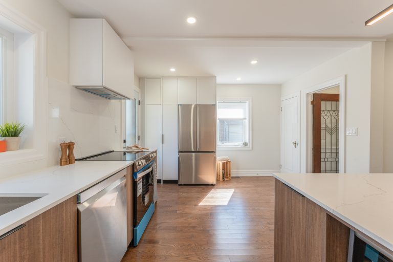 This multiple home renovation by Norseman Construction highlights our interior design team’s talent for creating modern, functional spaces. The bathroom features soft green tiles, a sleek glass shower, and a minimalist vanity, blending elegance with serenity. In the kitchen, warm wood cabinetry contrasts beautifully with clean white finishes, while thoughtful lighting and layout maximize functionality and style. These spaces are designed to feel both inviting and practical for everyday living